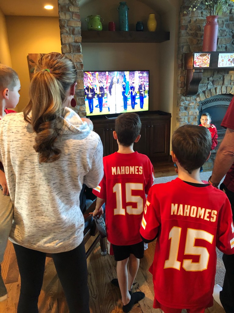 - Super Bowl party – still hard to believe Chiefs actually won a championship. If you’ve been a lifelong Chiefs fan, I am sure you are still amazed as well. Perhaps the best aspect of this picture is the family standing in the living room for the national anthem.