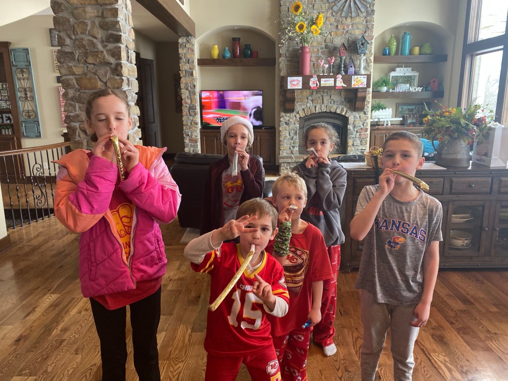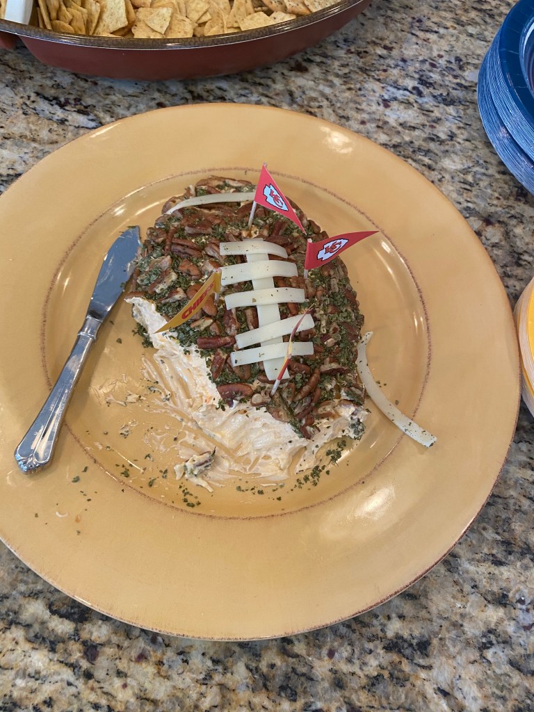 Grandma completed the goodness of the day by bringing football themed party bags for all the kids, a cheese ball shaped like a football and the noise makers. An observation…whoever invented these bad boys clearly didn’t have kids and wanted to punish anyone who did have kids. Also, that person should be in prison, because they are a criminal invention.