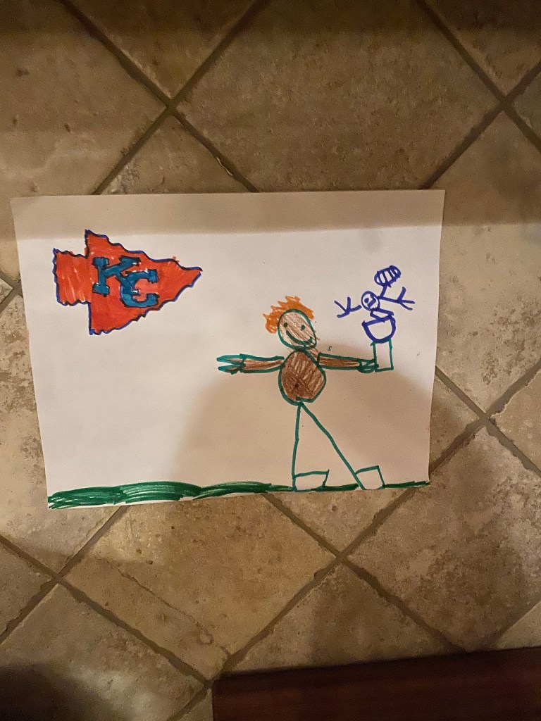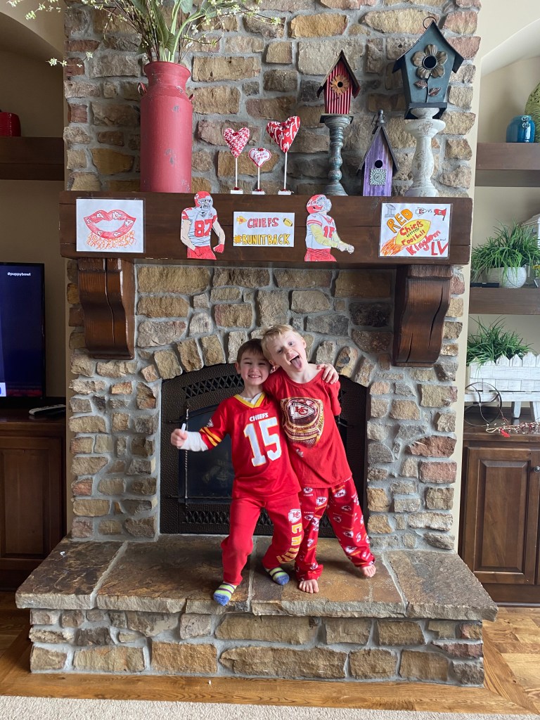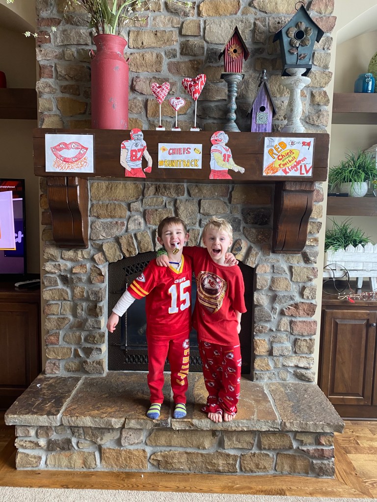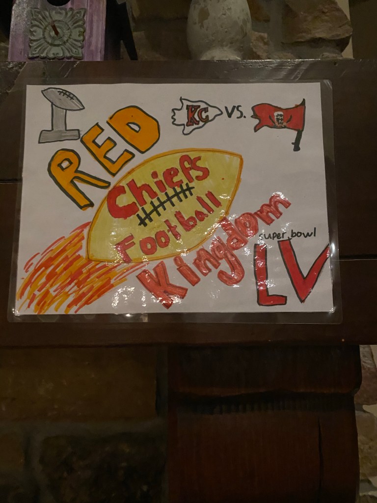 First of all, it’s important to celebrate all the decor our children provided. The kids have been drawing Chiefs pictures for weeks. I loved their excitement for the game, it was pretty special and they have no idea how lucky they are to grow up with their teams in Championship games like this on the regular. My favorite picture was Fletcher’s (bottom right) where he drew Patrick Mahomes throwing himself a touchdown (that he catches himself) all while holding the championship trophy. At least, this is how he explained it to me.