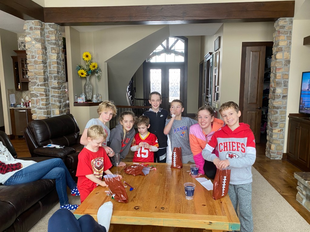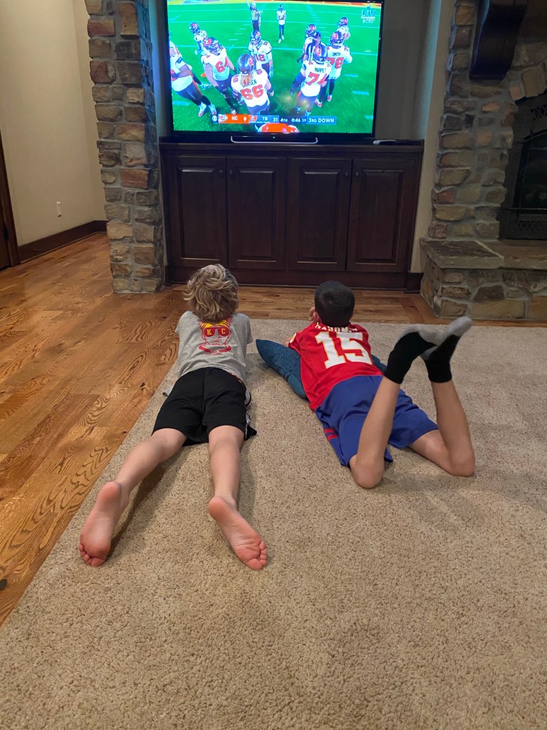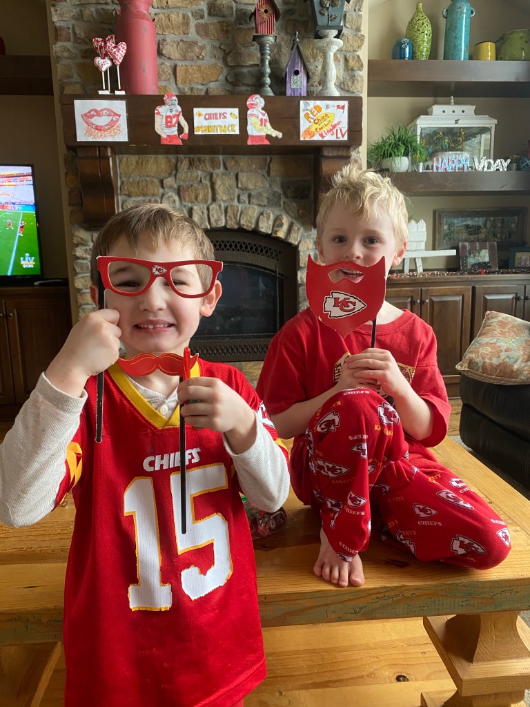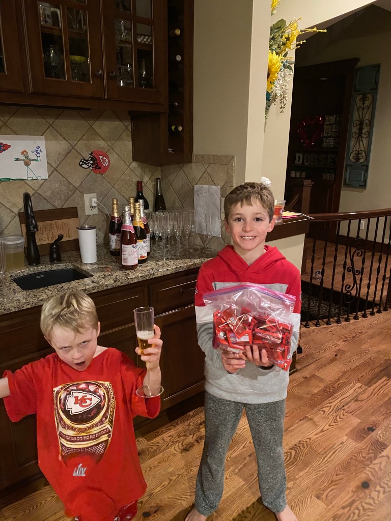 First of all, it’s important to celebrate all the decor our children provided. The kids have been drawing Chiefs pictures for weeks. I loved their excitement for the game, it was pretty special and they have no idea how lucky they are to grow up with their teams in Championship games like this on the regular. My favorite picture was Fletcher’s (bottom right) where he drew Patrick Mahomes throwing himself a touchdown (that he catches himself) all while holding the championship trophy. At least, this is how he explained it to me.