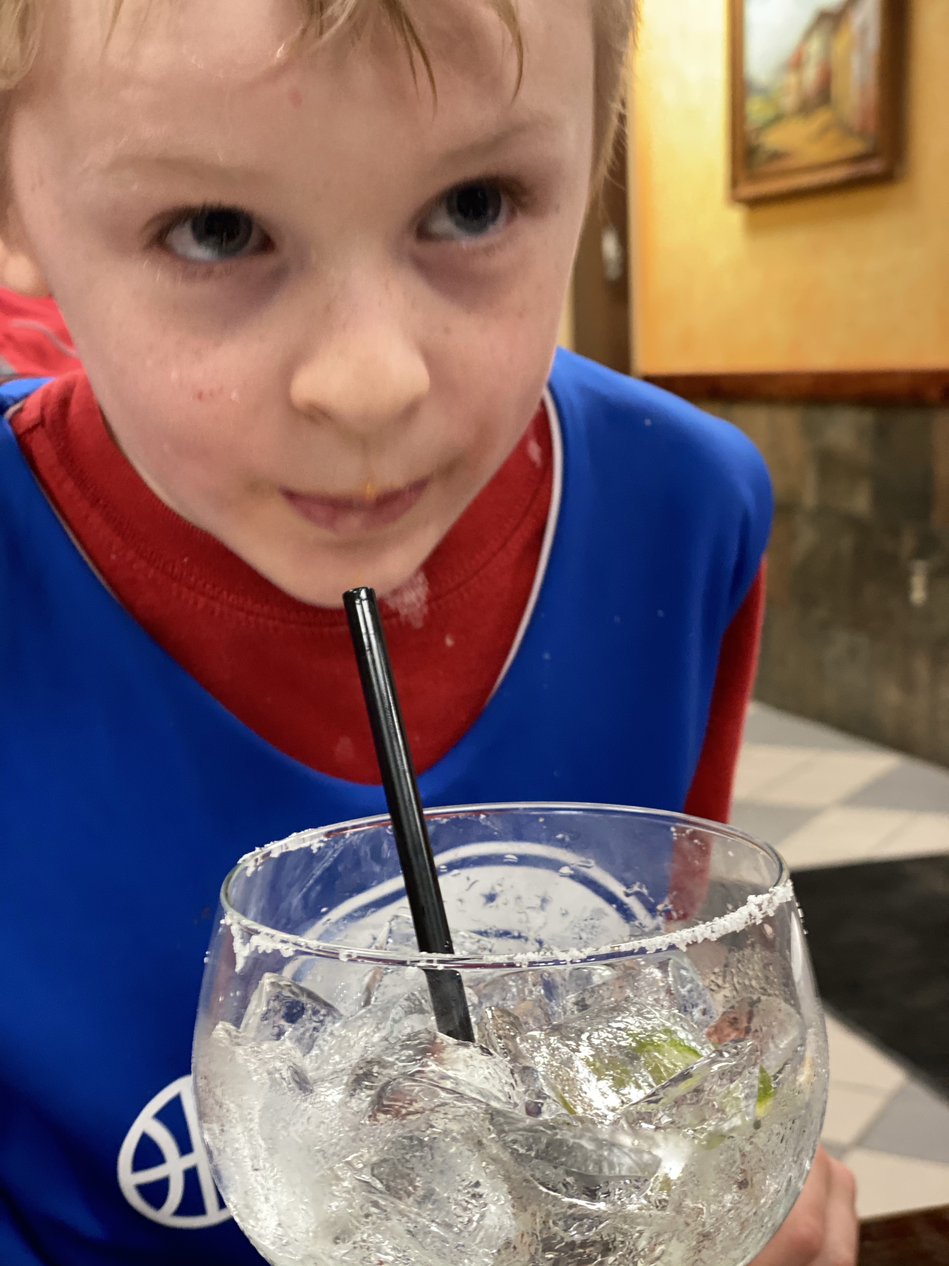 We went for a post Dorsey day of basketball dinner and this kid tried to sneak a drink of Daddy’s margarita. Little booger. Pray for me.