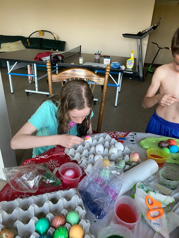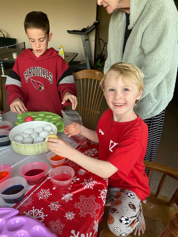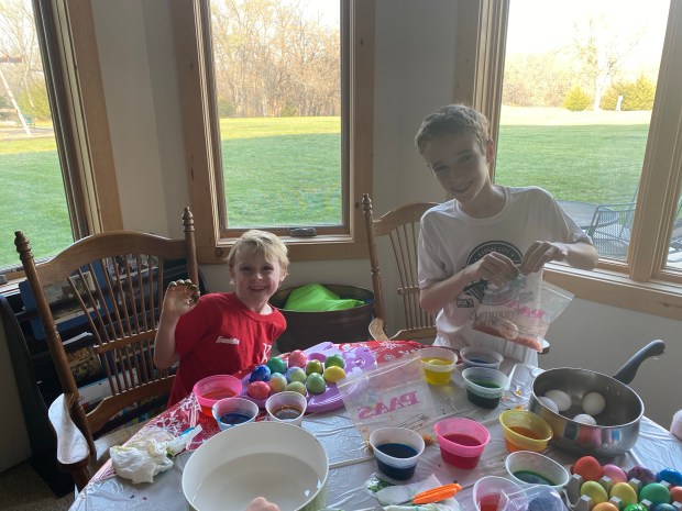 These two are into quantity over quality for sure. Cooper and Fletcher are such super similar humans!Slow and steady for Finley Joe on the egg dying extravaganza. He only had one at this point…his Chicago Bulls egg!