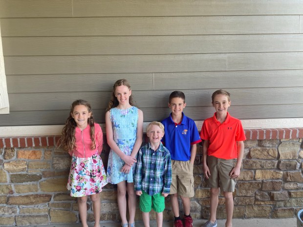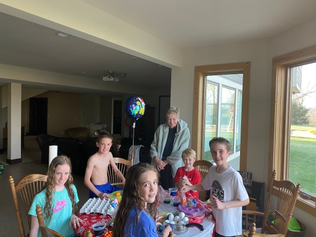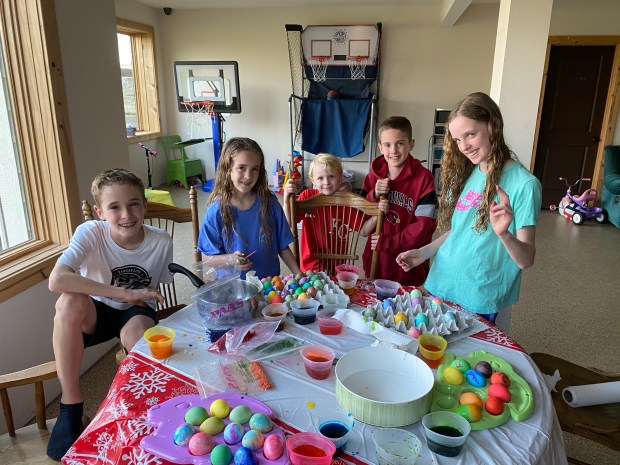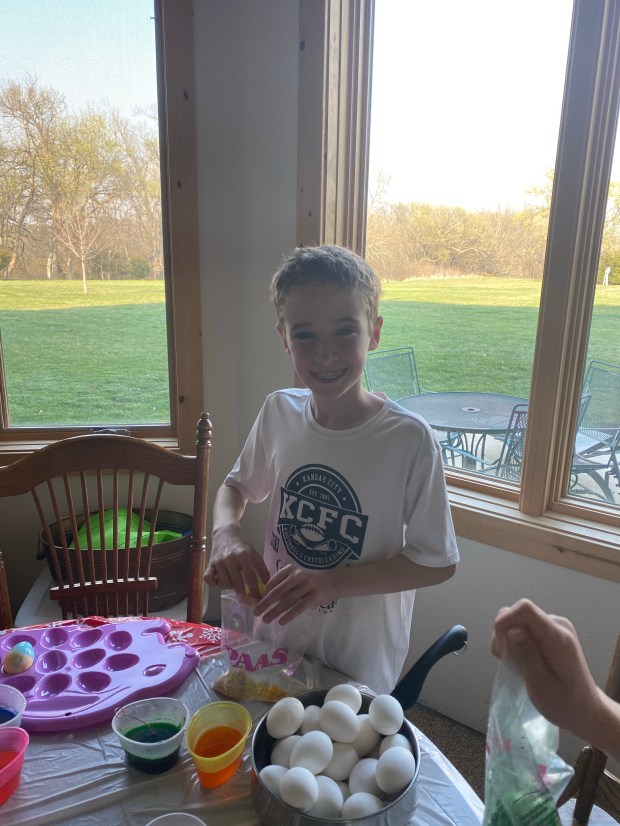 The actual Easter festivities started with the annual Easter egg dying contest. It was the same as it has been all our previous years. Cooper and Fletcher dye as may eggs as possible in the quickest format possible. Finley meticulously makes his Michael Jordan and Jayhawk eggs, as well as a few eggs with his favorite jersey numbers and Fiona tries to make some kind of crazy concoction of color. Then Ellen takes her time carefully crafting each egg into an artistic masterpiece. I think if I let her, she’d sit there all day decorating eggs.