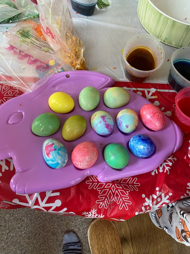 The new addition of the rice dye was a good touch. It made some fun marble like eggs the kids were all about…did make our hands pretty dirty though…oh well, that’s part of the fun!